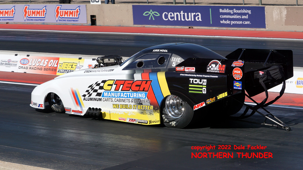 Next up were the Funny Cars, with Top Ten runners Shane Westerfield, Kris Hool, and Kyle Smith. Two local racers, Bill Bernard and Doug Schneider were joined with Funny Car newcomer (after a long stint in the dragster class), Christine Chambless Foster, with husband Chris Foster tuning the new car.