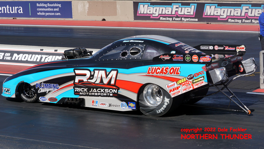 (LEFT) Next up was national points leader Shane Westerfield in the Rick Jackson Motorsports Camaro. In four races to this point, the team notched two wins (one national, one regional) and two runnersup (again, a national and a regional), and were looking for another final round berth at Bandimere. On his first pass, Westerfield cranked out an excellent 5.834 - 251.30 to show everyone that they had a serious high altitude tuneup.