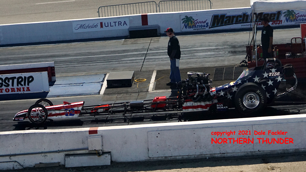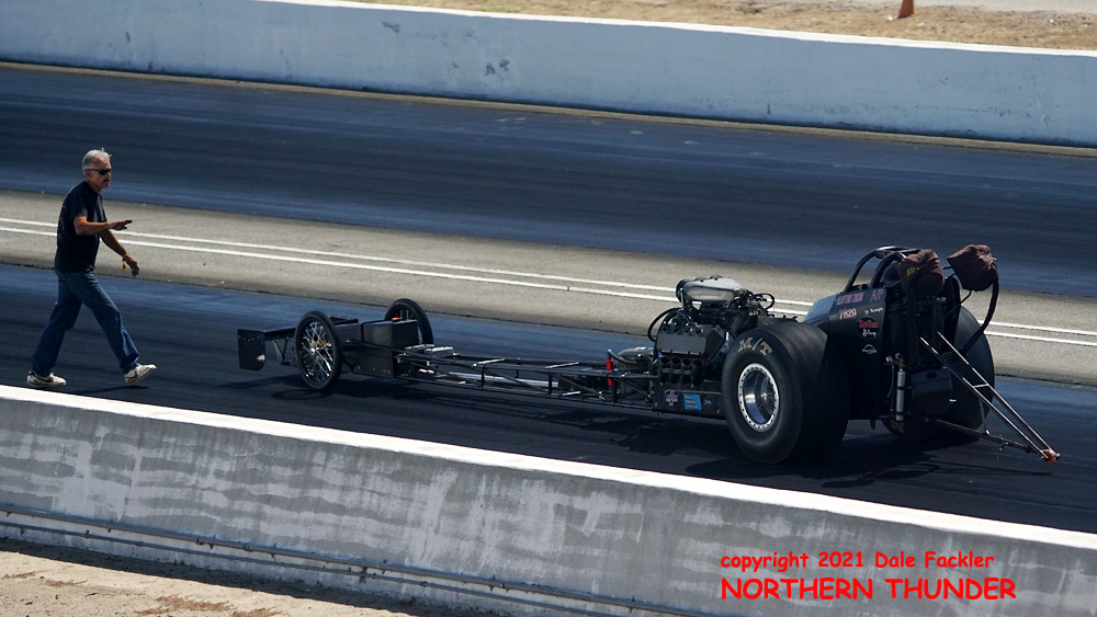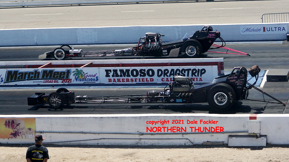 We've fallen victim to a modern inconvenience: a sloooooowwww wi-fi connection at the motel, as Dale Fackler is slowly sending us the results of all his hard work from the grandstands at Bakersfield yesterday. We've got one photo so far, with Dylan Winefsky making a test pass in father Robert's "Nitro Moose" AA/Fuel Altered. The plan is for 16-year old Dylan to finish licensing in Tucson, then take over the reins from his dad, who's making his final driving appearance at this year's Good Vibrations March Meet.