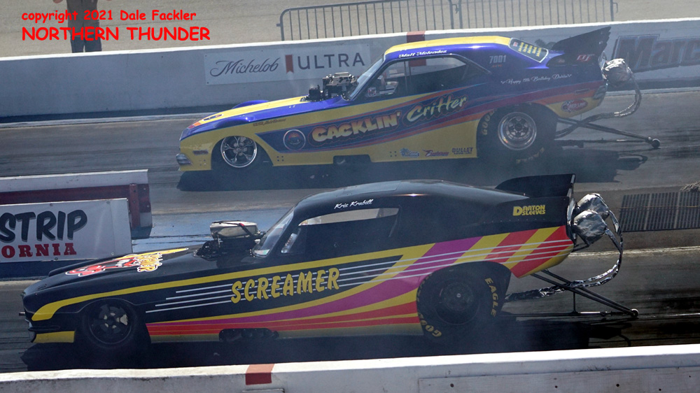 (LEFT) In the near lane, Kris Krabill got acclimated to his new ride in the "Screamer", with a half track pass (6.79 - 139.06, while in the far lane, Matt Melendez carded a solid 5.90 - 230.61 in the "Cacklin' Critter" Challenger