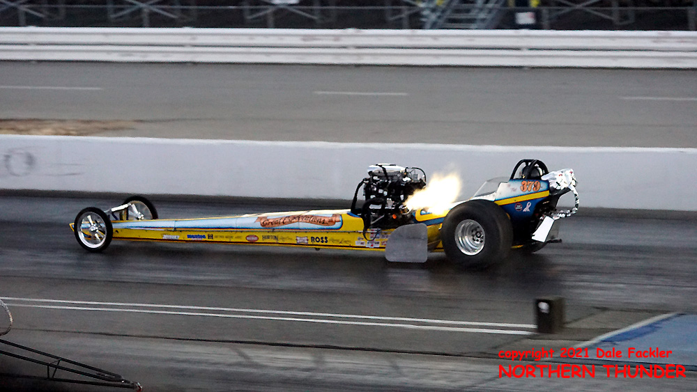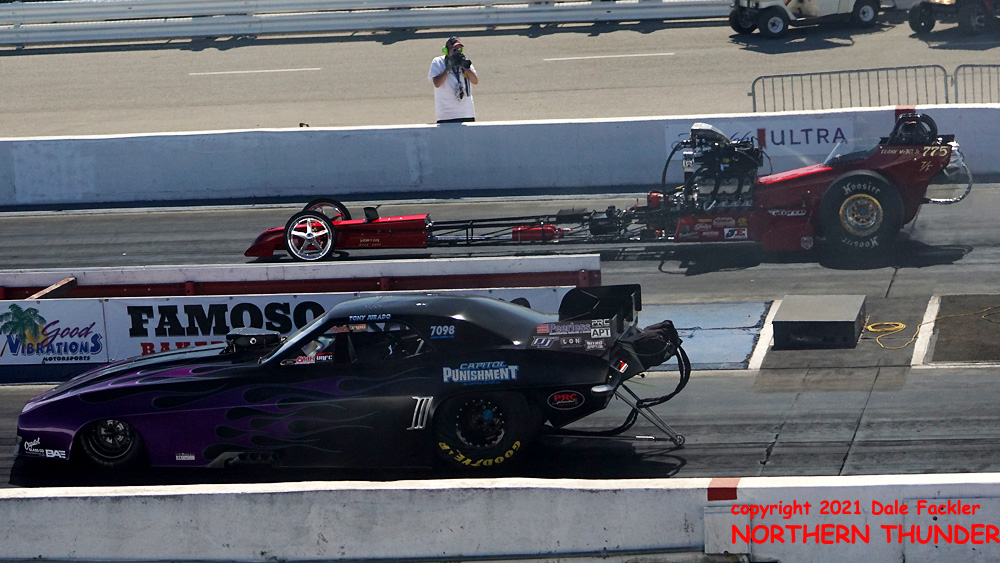 Getting in a solid pass was Jim Murphy in his WW III entry as he laid down a 5.91 - 249.53 (near lane), while on the far side, the unique looking and sounding (small-block Chevy power) "Champion Speed Shop Special" driven by Adam Sorokin shut off early to a 6.48 - 162.18
